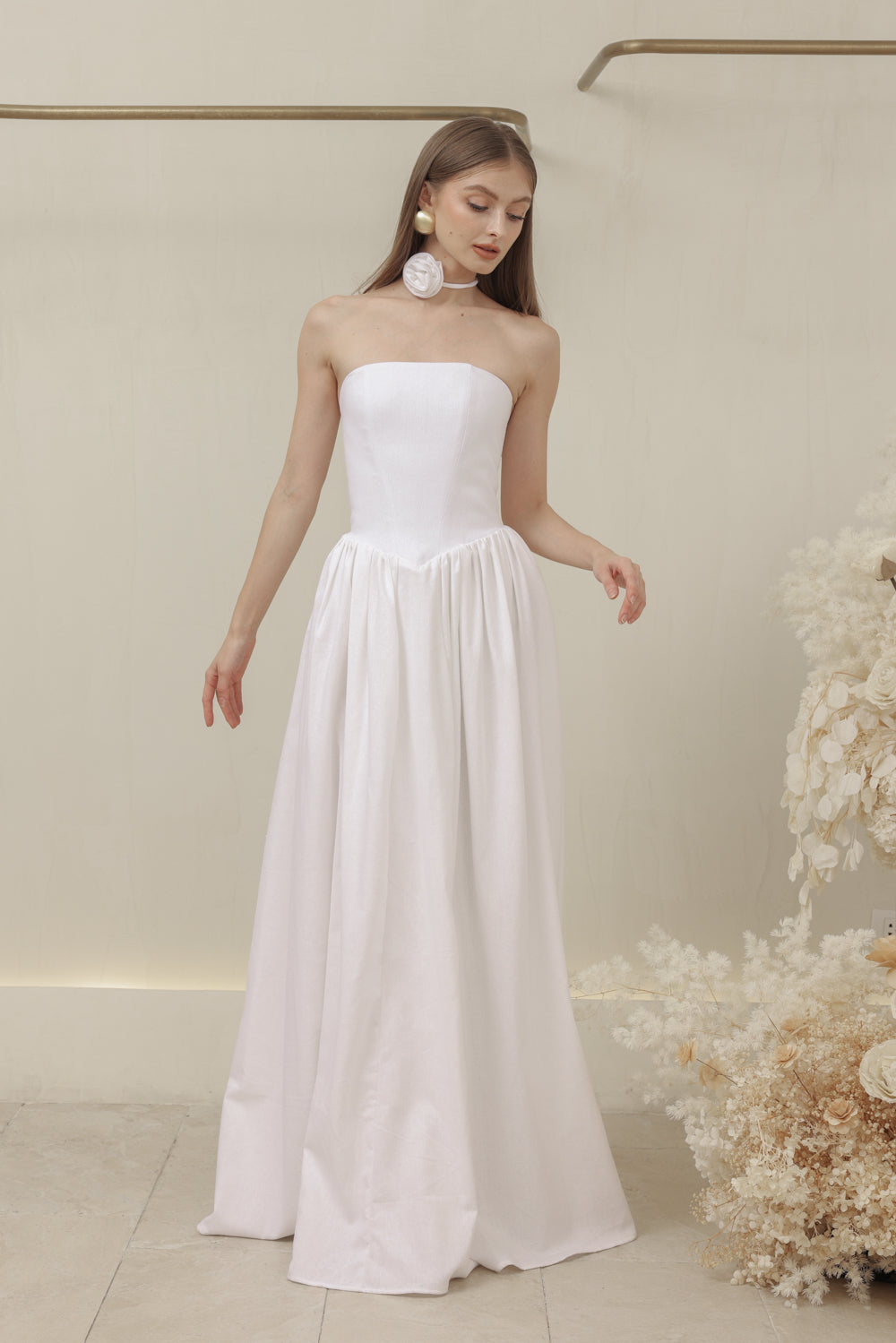 CAPUCINE DRESS Strapless Baroque Style Waist Maxi Dress with Floral Neckpiece (White Linen)