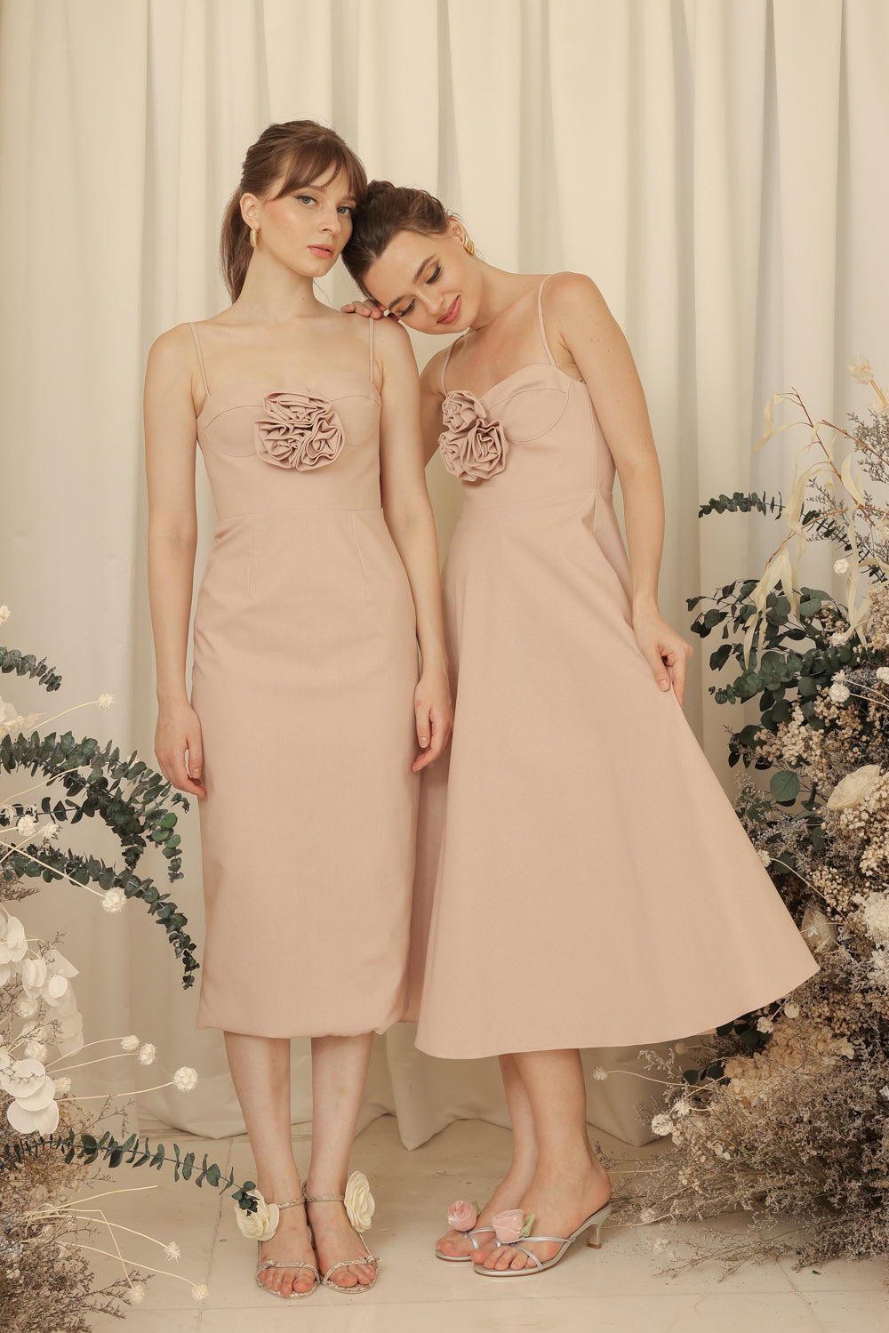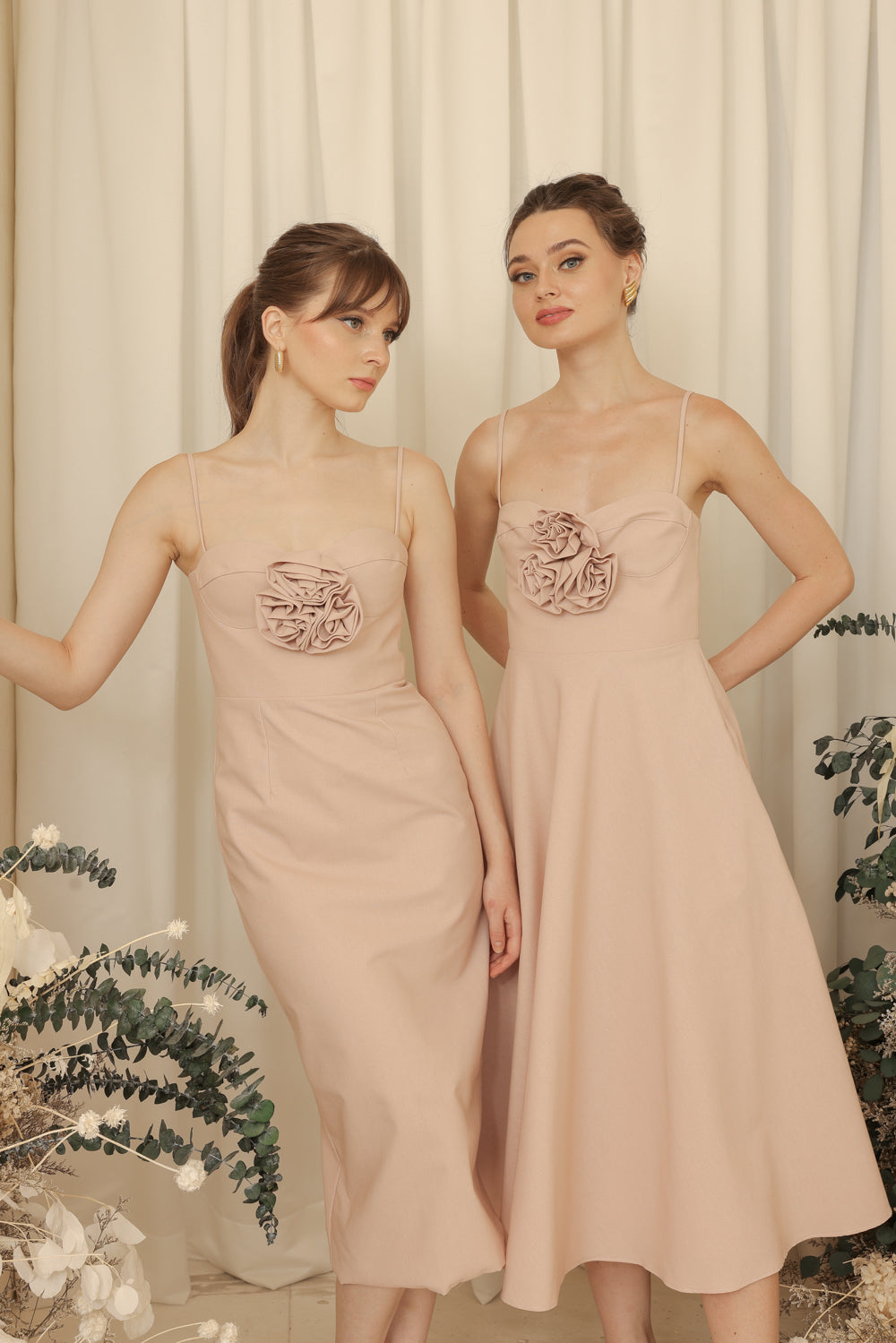 CHLOE Strappy Pencil Cut Midi Dress with Pockets and Trio Floral Detail (Blush Linen Blend)