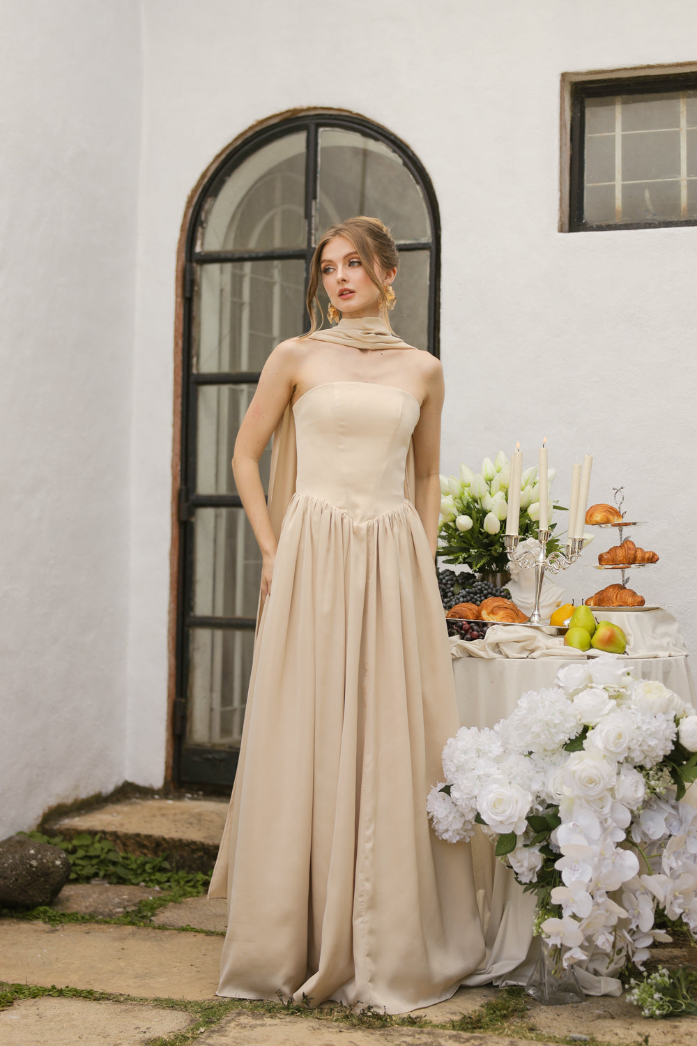 CLEO Strapless Drop Waist Maxi with Covered Button Back Detail and Sash Neckpiece (Nude Korean Silk)