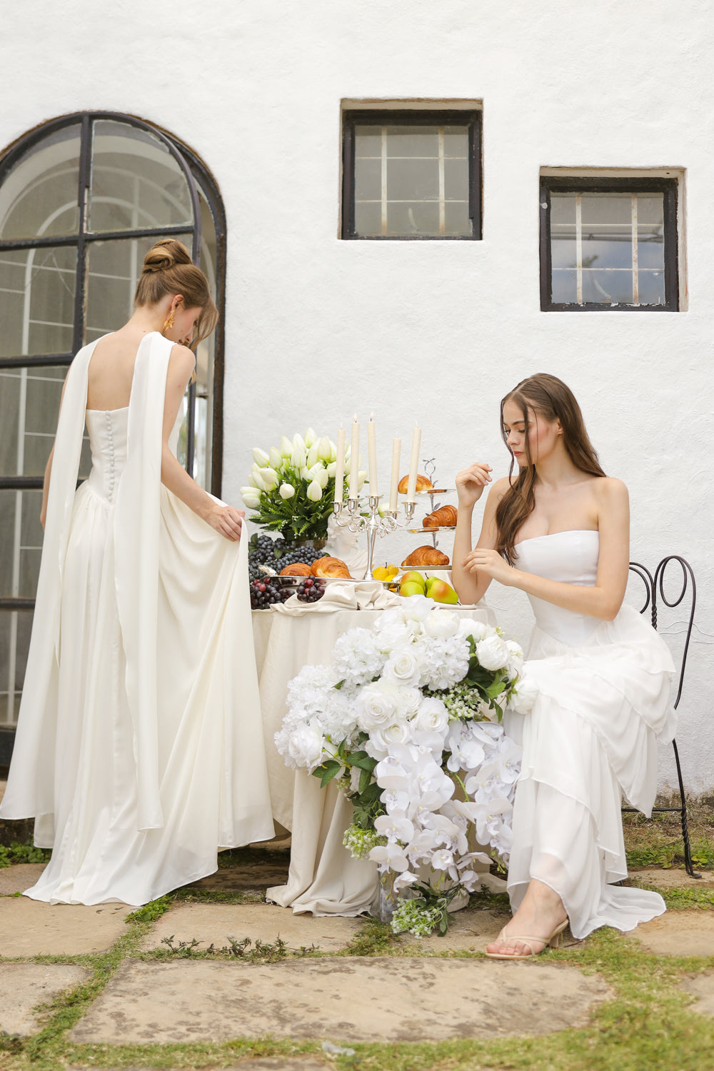 Radiant and ethereal, the new Cleo dress is a drop waist dress with strapless fitted bodice and covered button detail at the back. The shirred skirt is flowy and full of life. Finished with a sash neckpiece. It is THE dress for formal spring occasions.