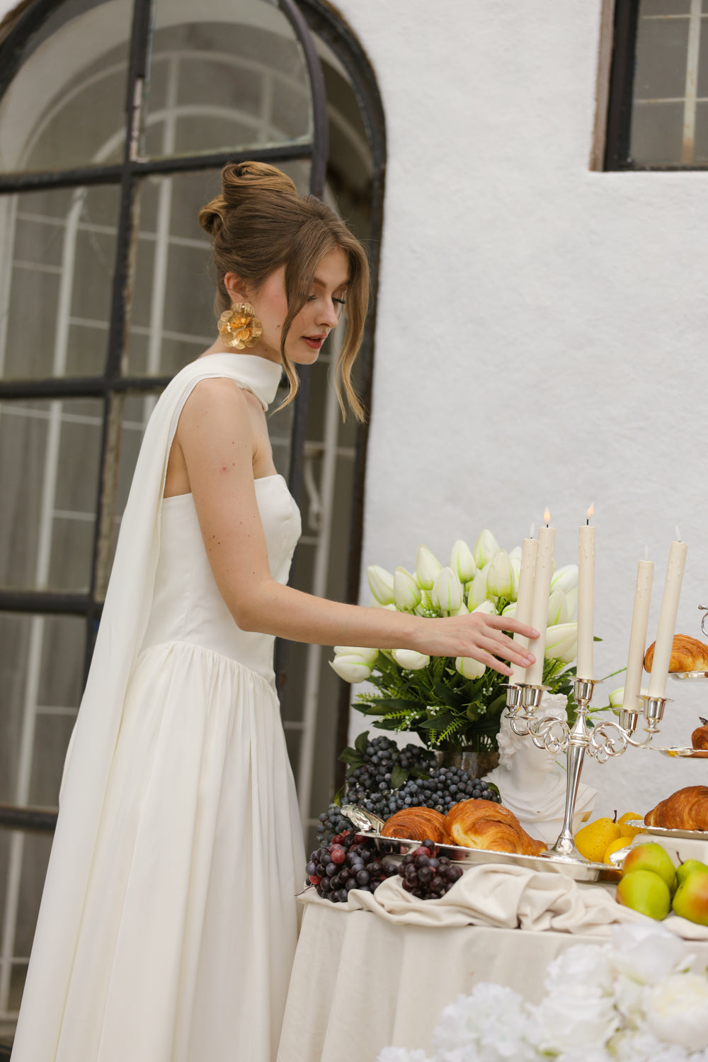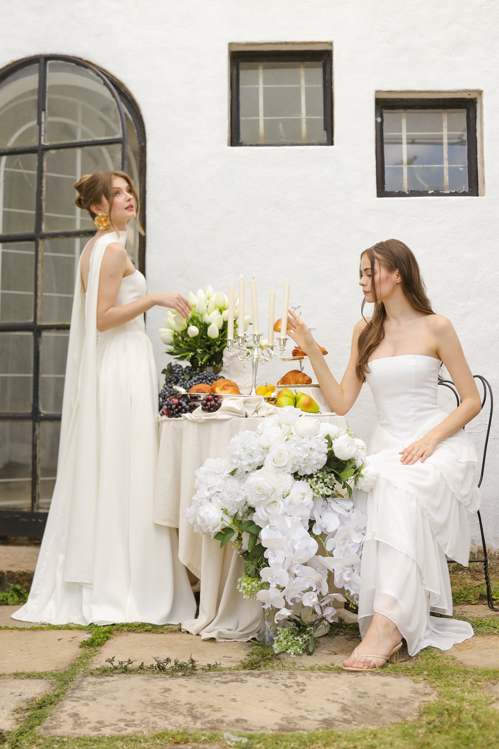 CLEO Strapless Drop Waist Maxi with Covered Button Back Detail and Sash Neckpiece (White Korean Silk)