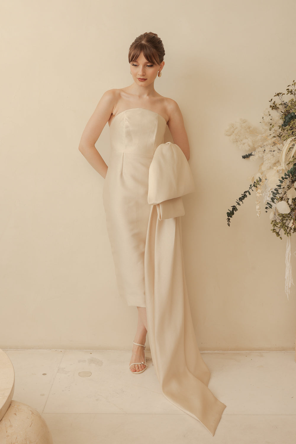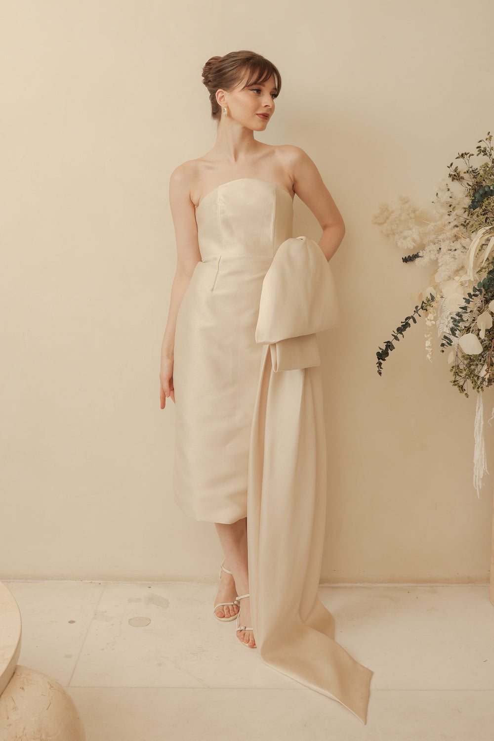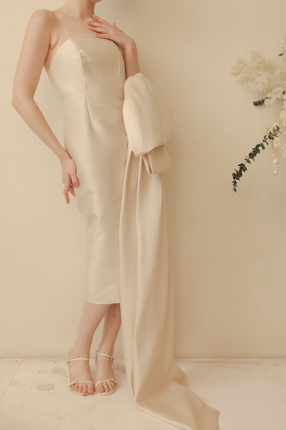 CORAZON Curve Neckline Pencil Skirt Midi Dress with Side Bow Trail (Light Gold Gazaar)