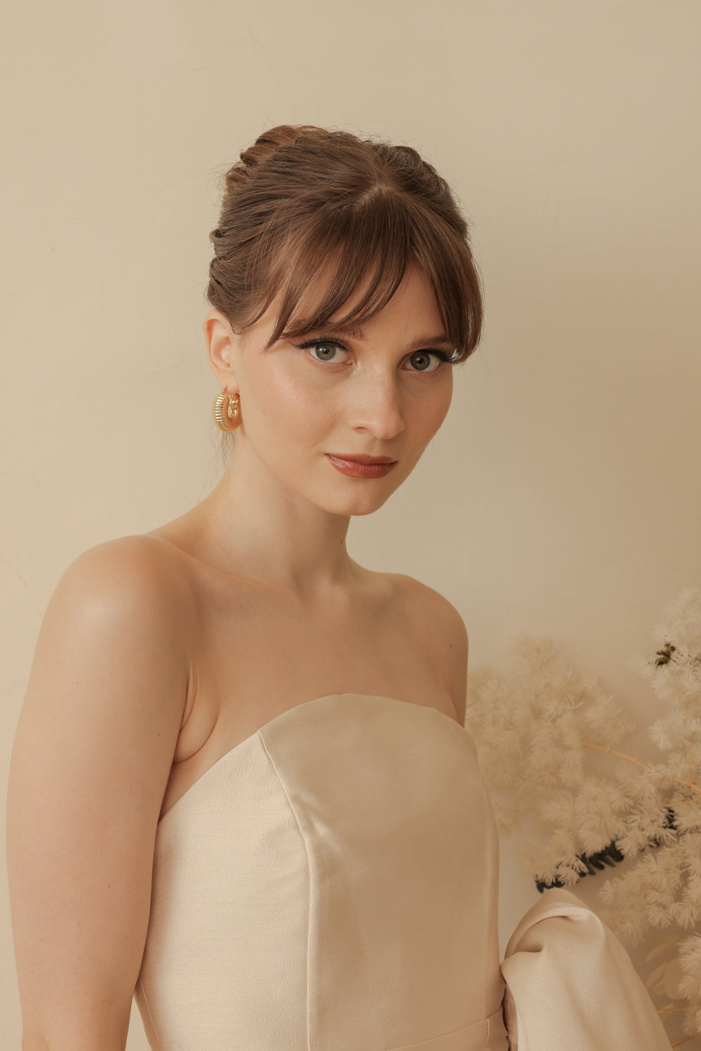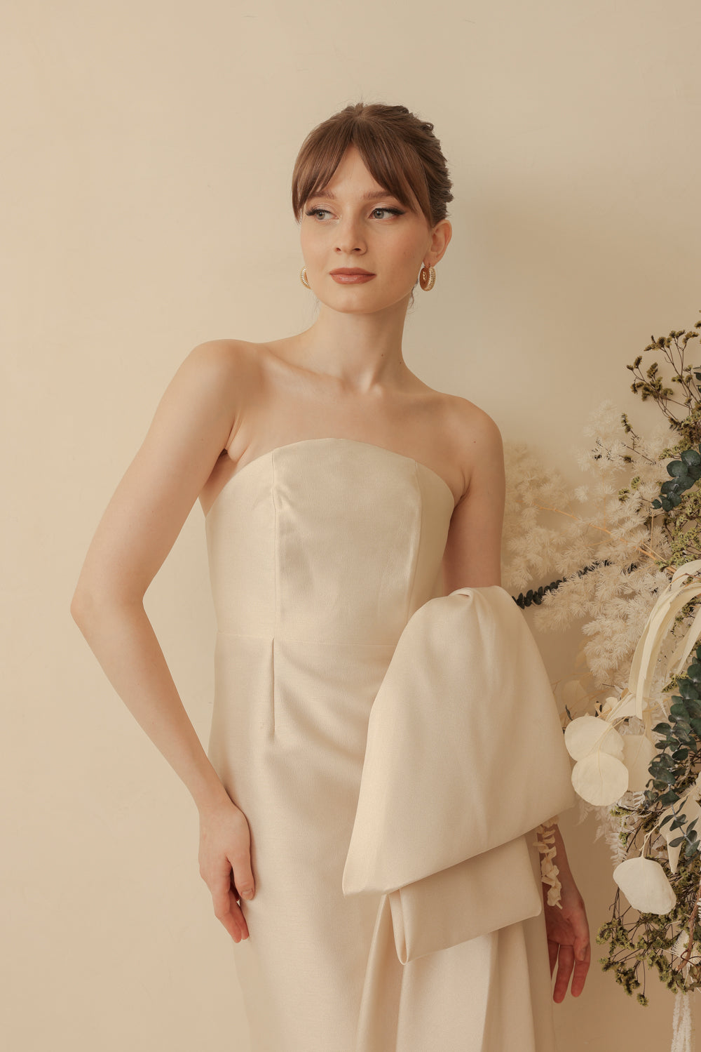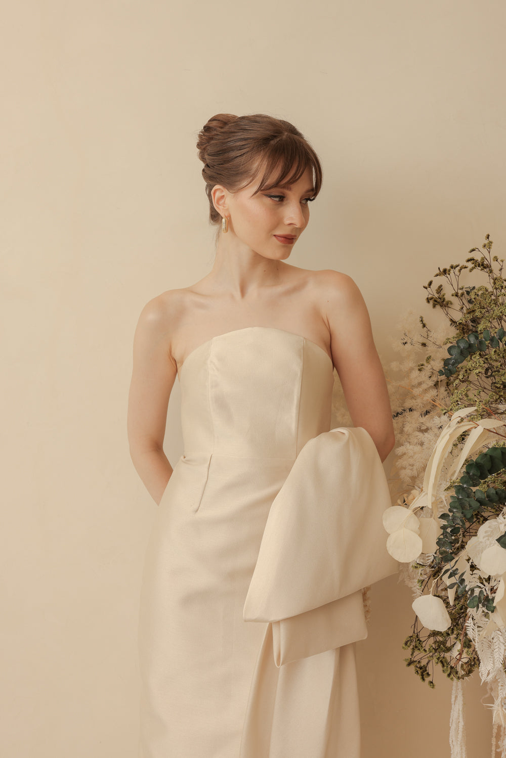 CORAZON Curve Neckline Pencil Skirt Midi Dress with Side Bow Trail (Light Gold Gazaar)