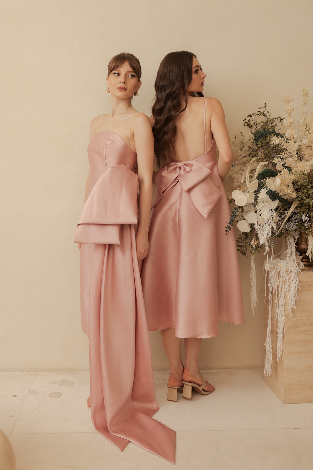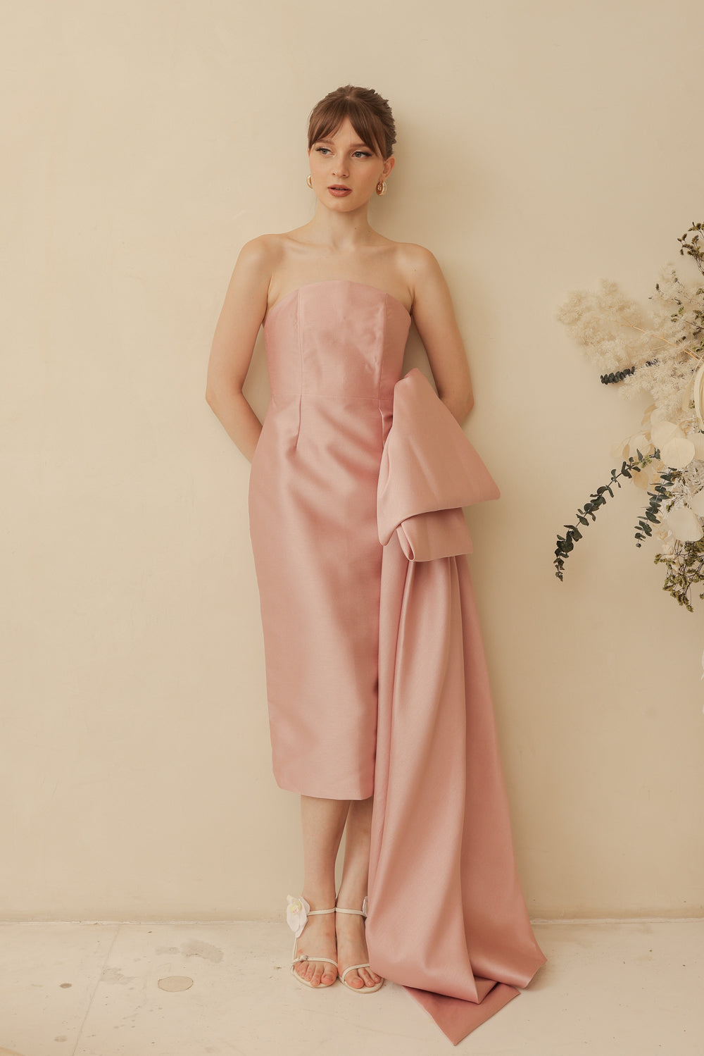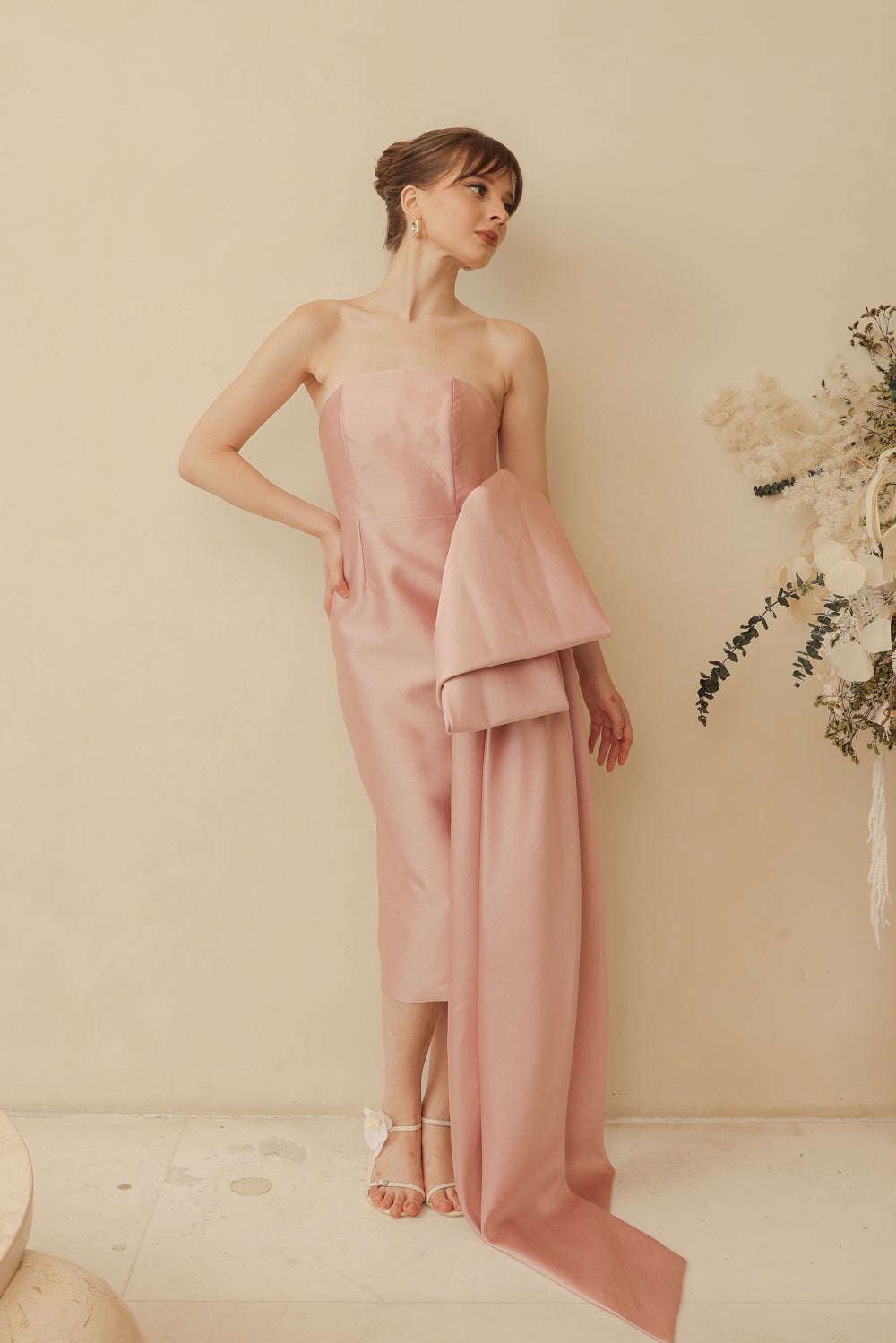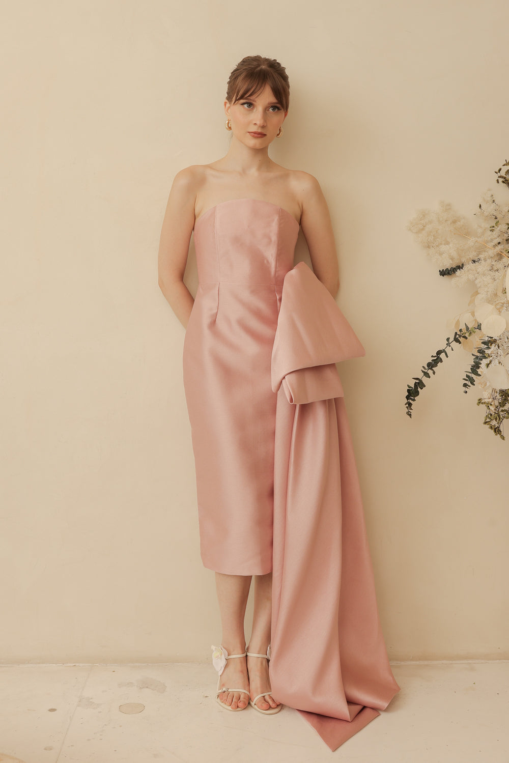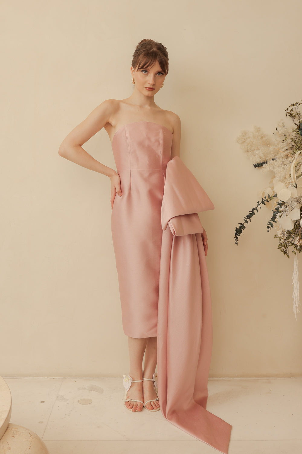 CORAZON Curve Neckline Pencil Skirt Midi Dress with Side Bow Trail (Old Rose Gazaar)