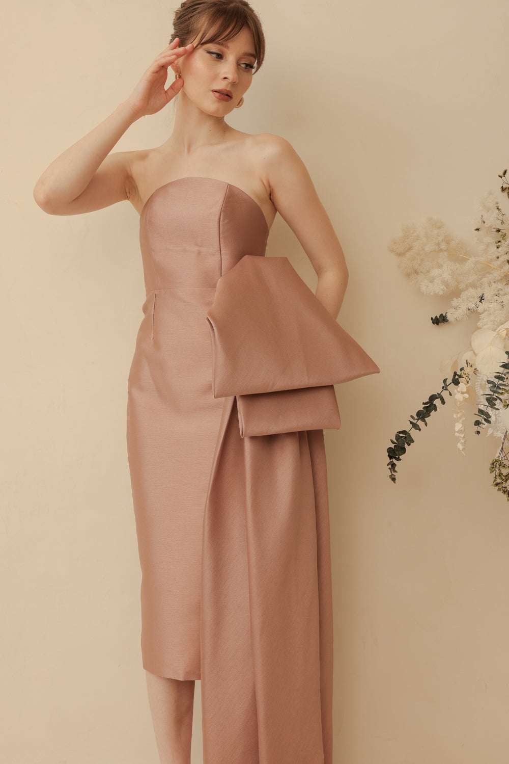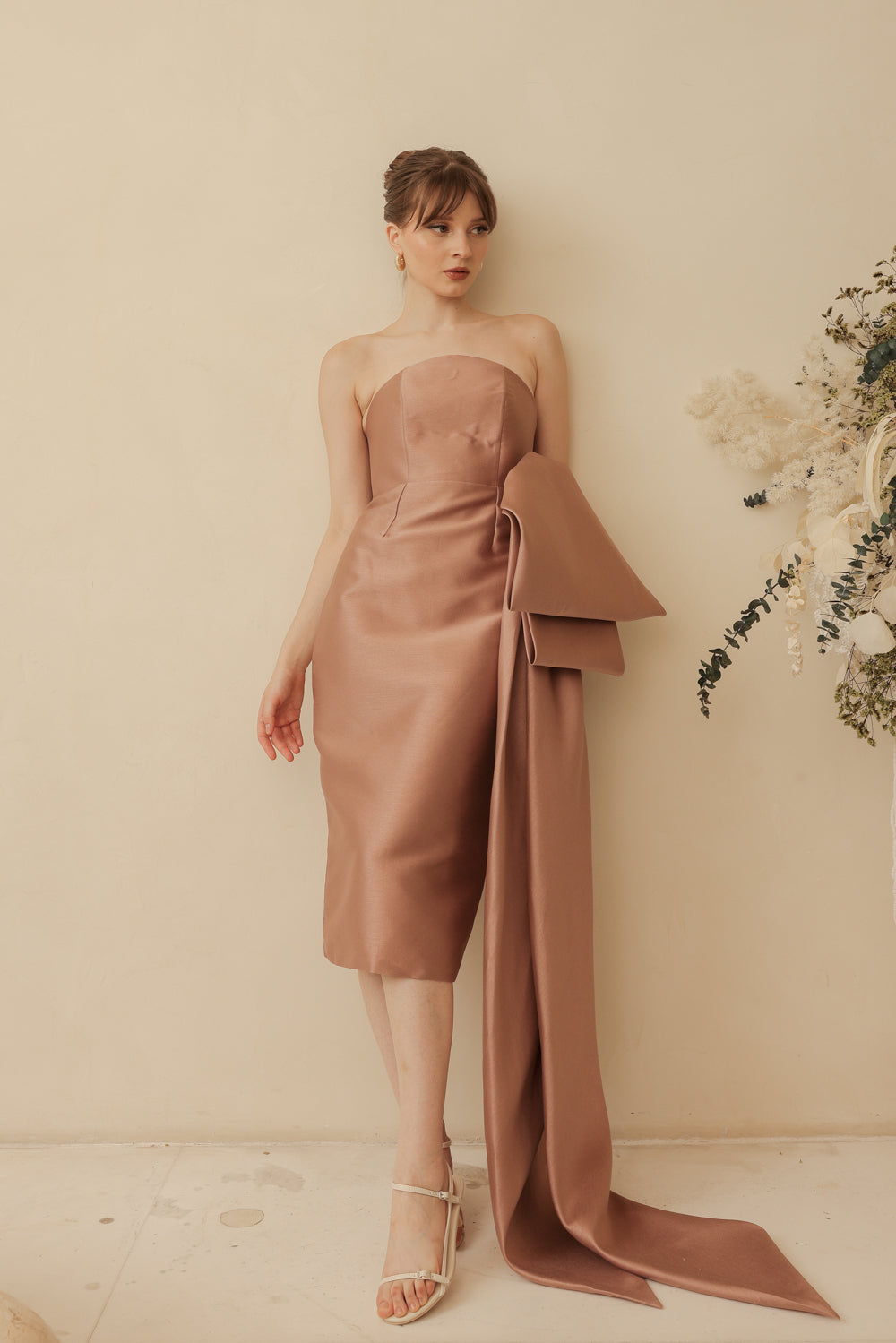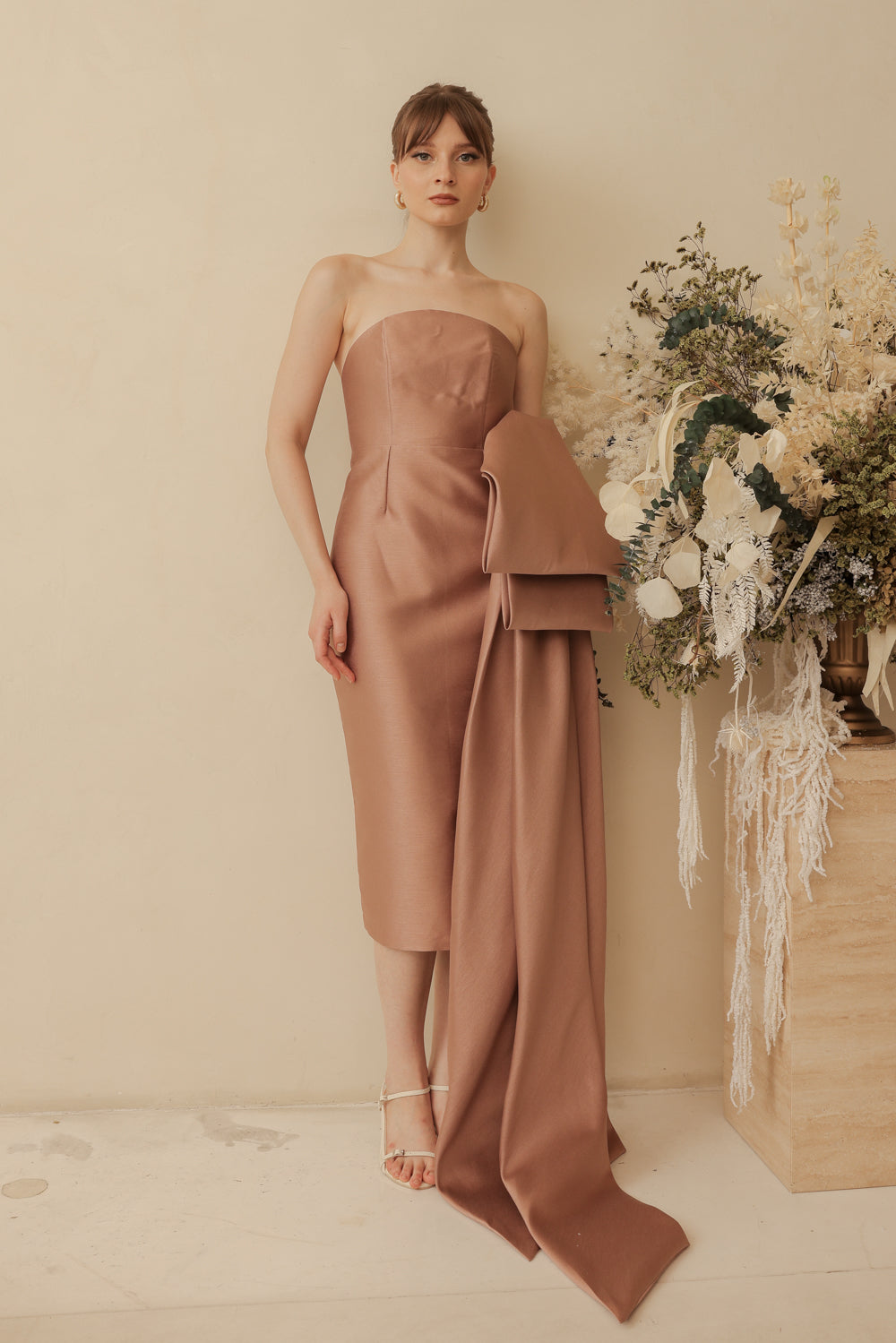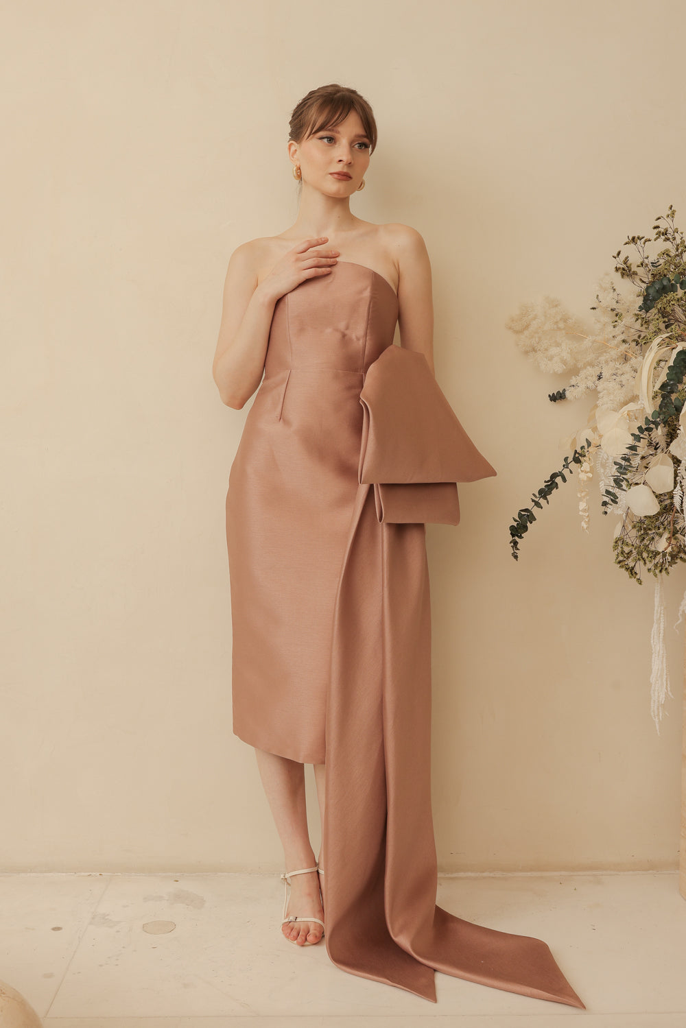 CORAZON Curve Neckline Pencil Skirt Midi Dress with Side Bow Trail (Taupe Gazaar)