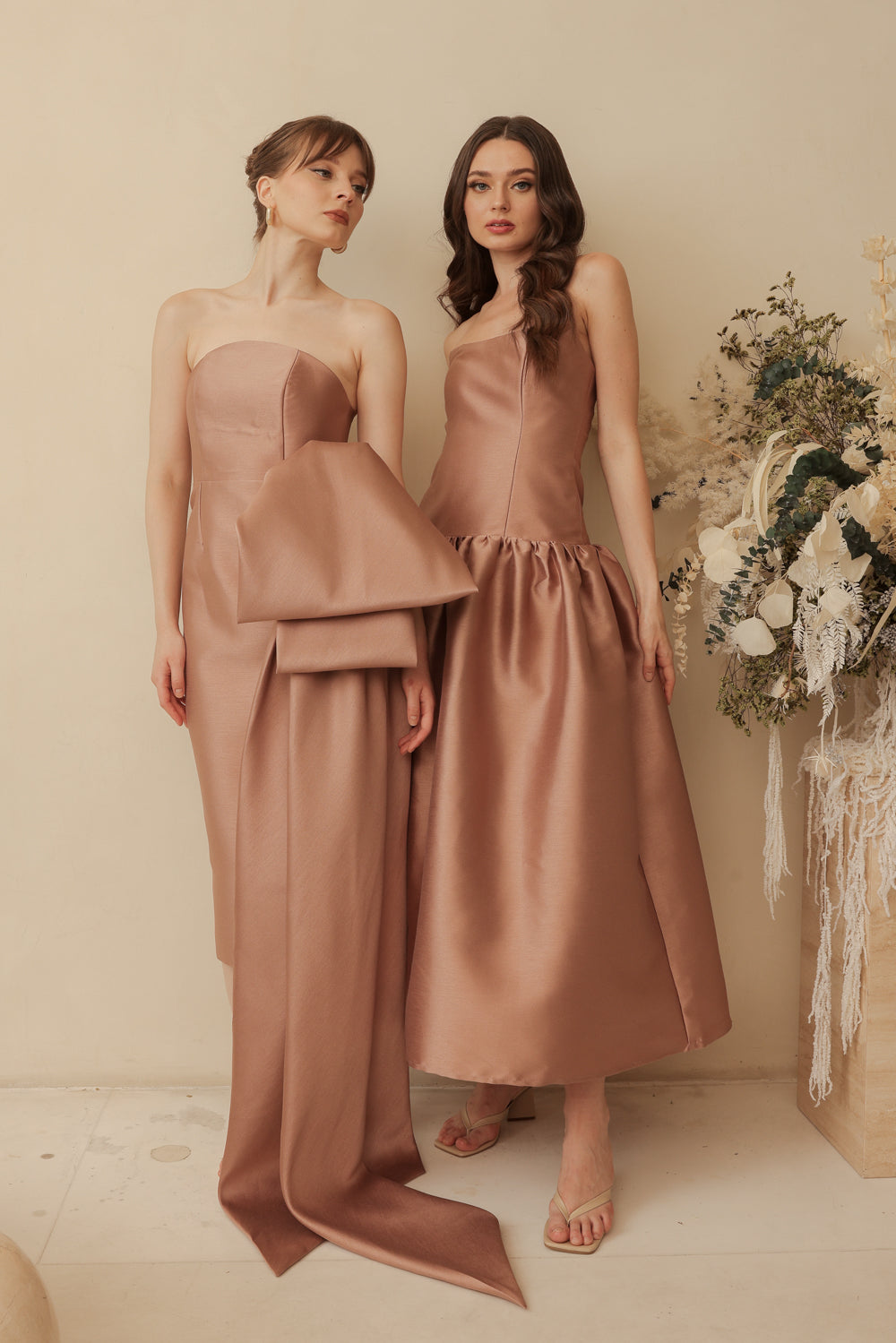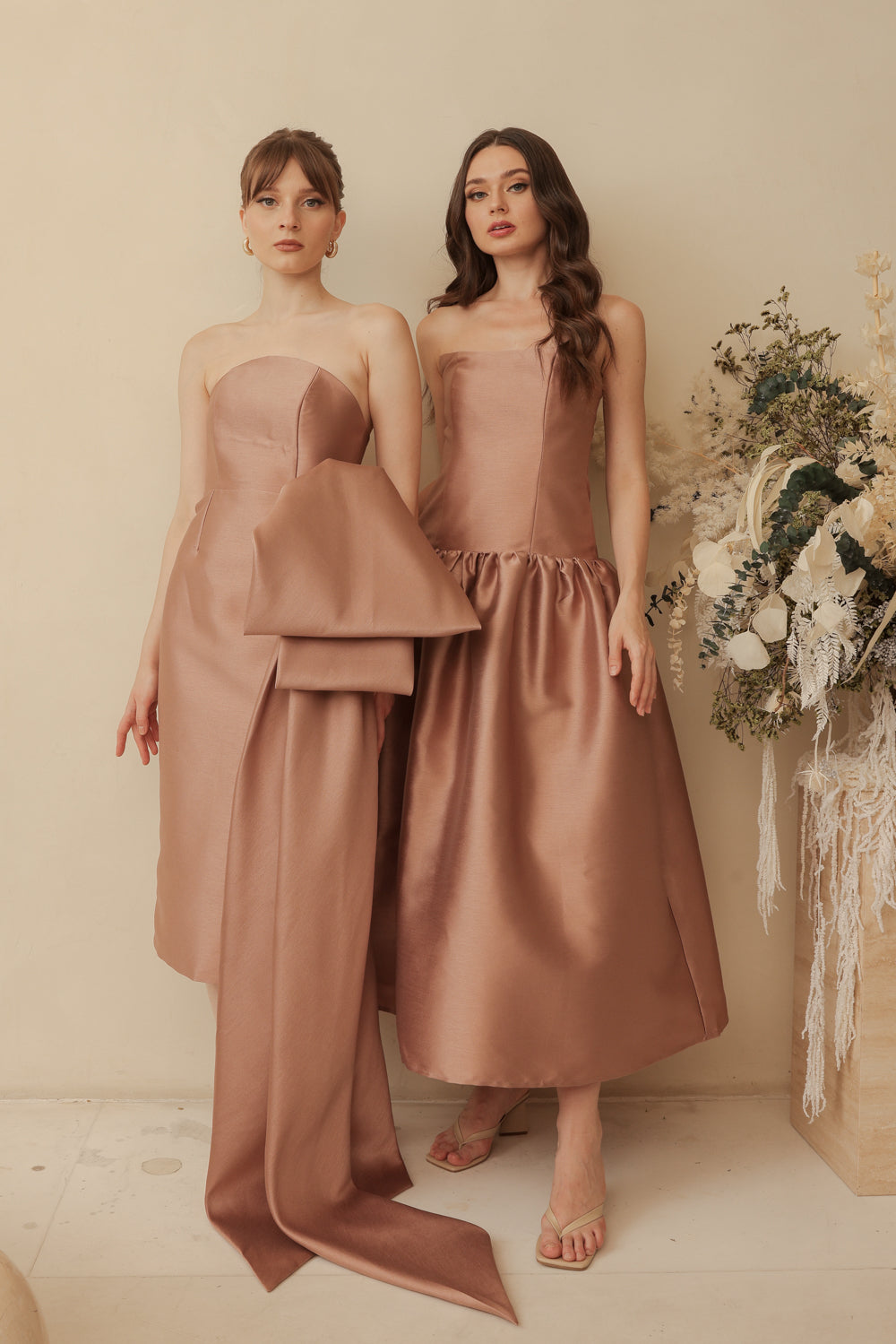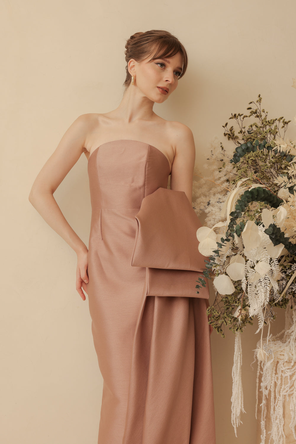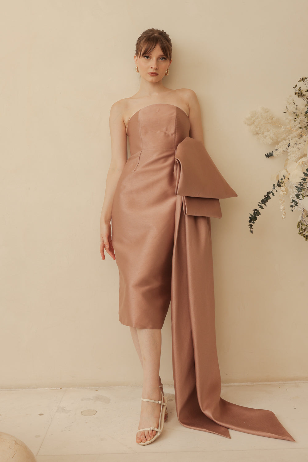 CORAZON Curve Neckline Pencil Skirt Midi Dress with Side Bow Trail (Taupe Gazaar)