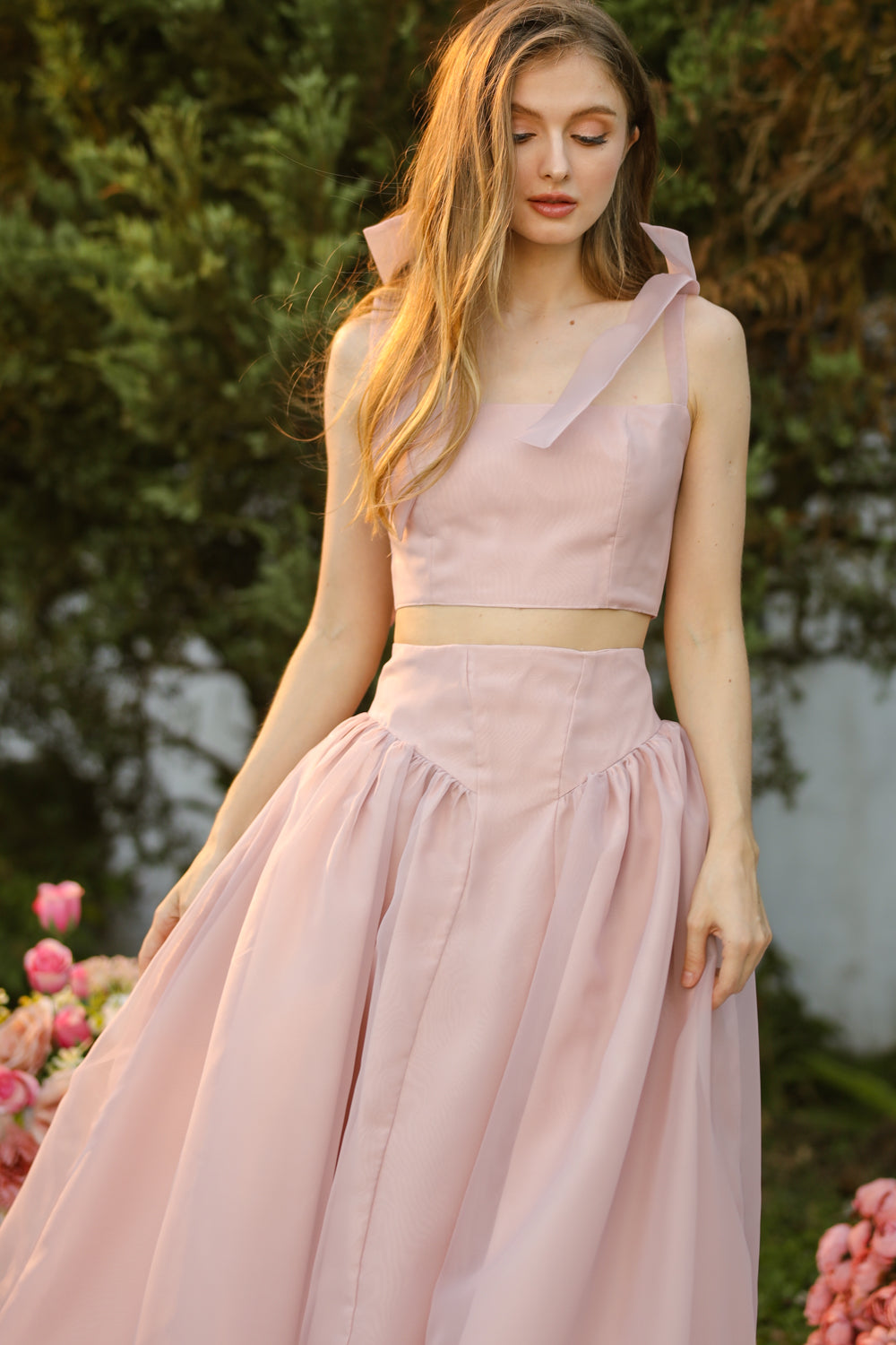 DOMIKA Sleeveless Bow Midi Dress with Drop Waist Shirred Skirt (Old Rose Matte Organdy)