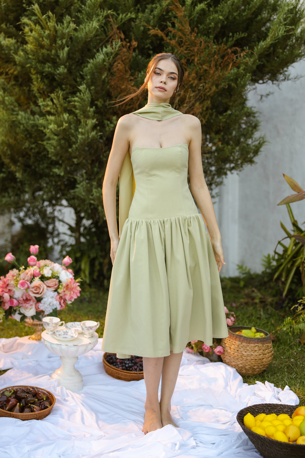 ELODIE Strapless Drop Waist Midi Dress with Sash Neckpiece (Sage Green Linen Blend)