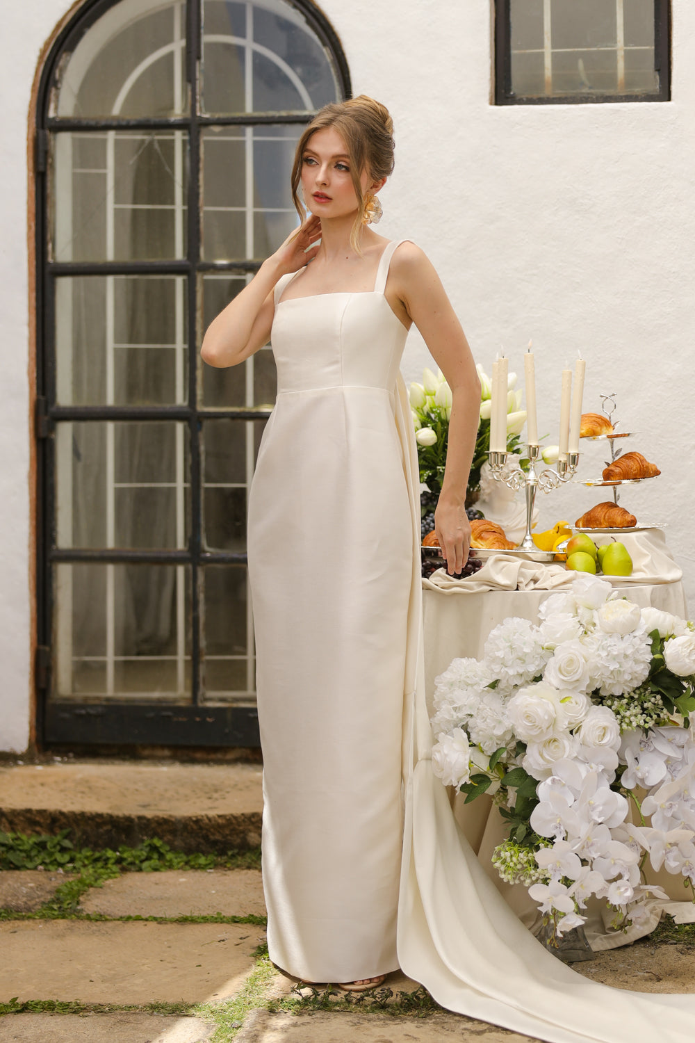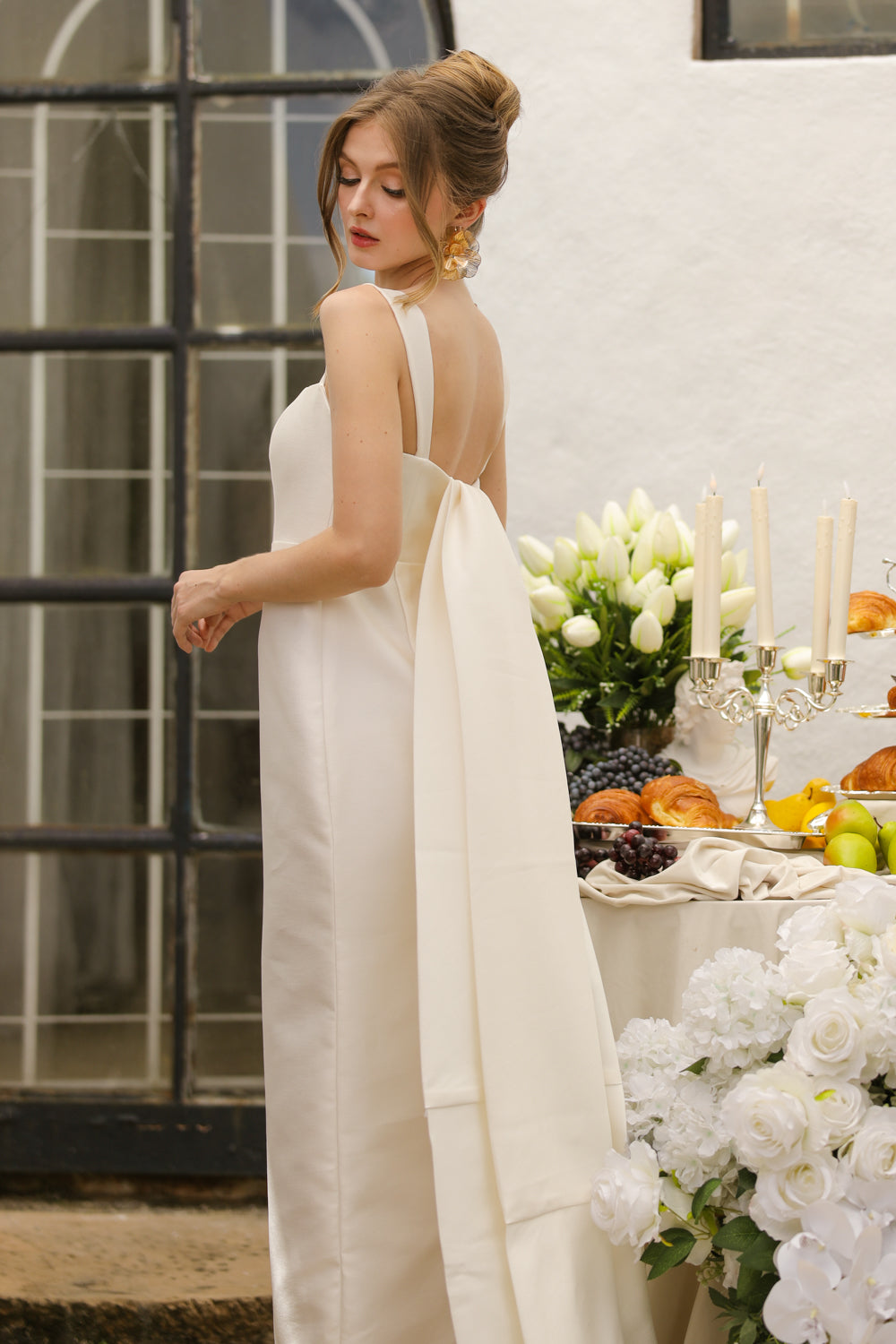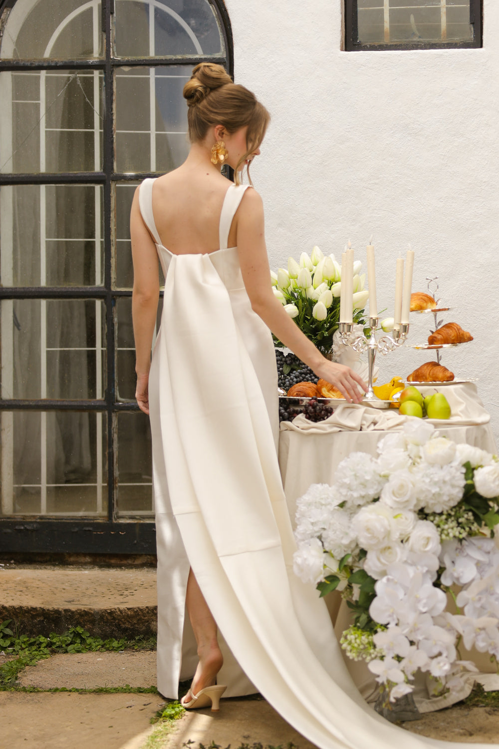 GABRIELA Strappy Straight Cut Gown with Detachable Bow Trail (Ivory White Gazaar)