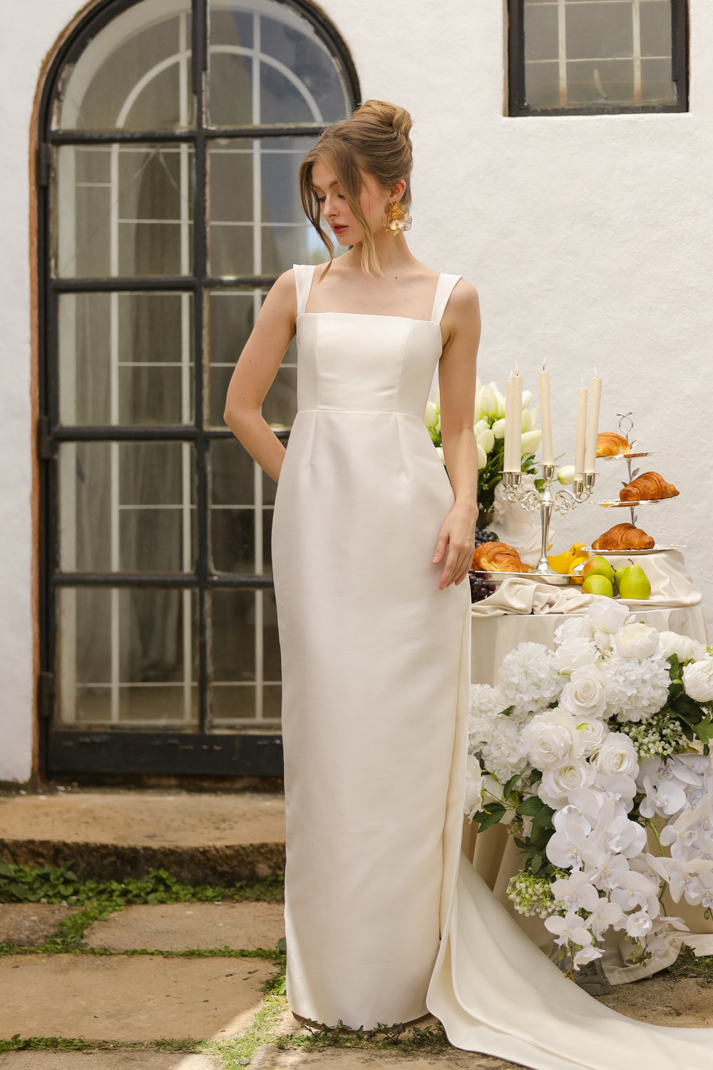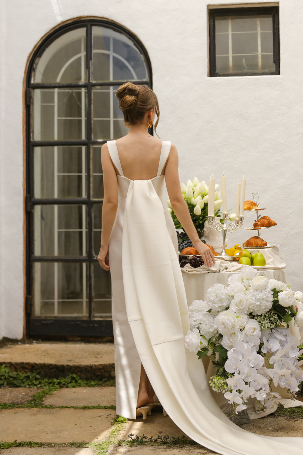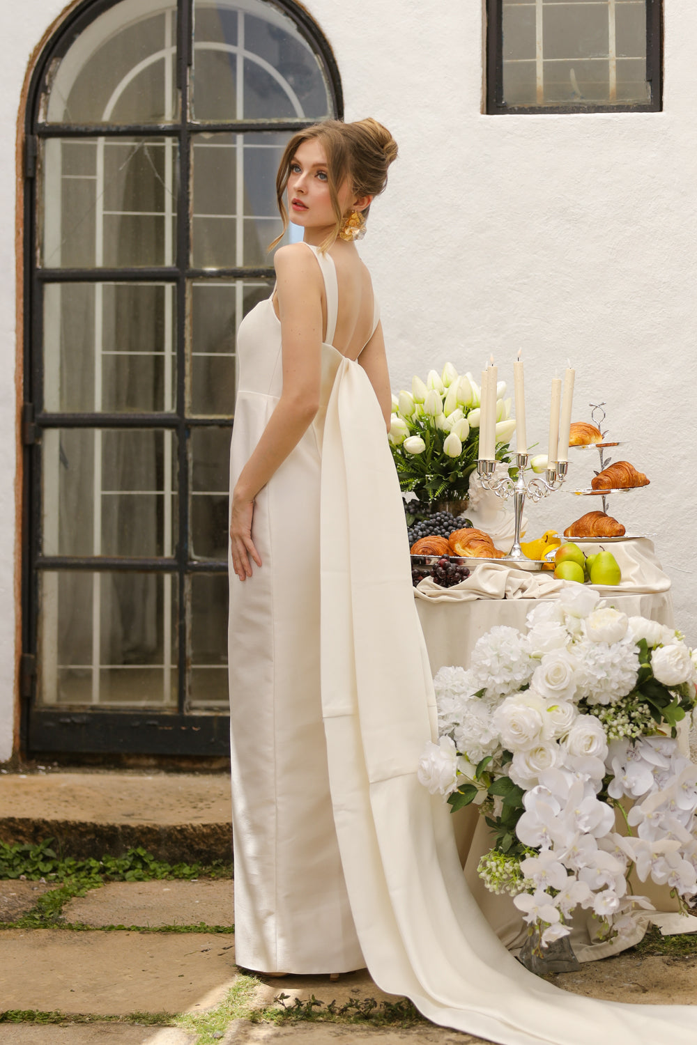 GABRIELA Strappy Straight Cut Gown with Detachable Bow Trail (Ivory White Gazaar)