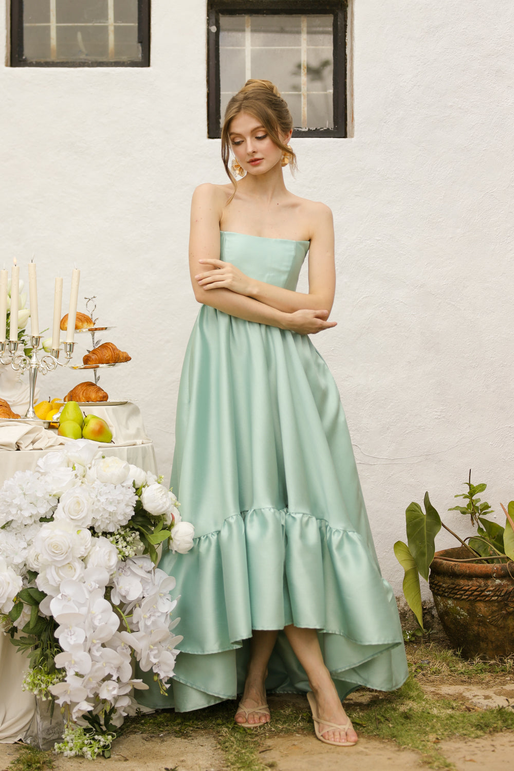 MADELEINE Strapless High Low Gown with Ruffle Hem (Sage Green Gazaar)
