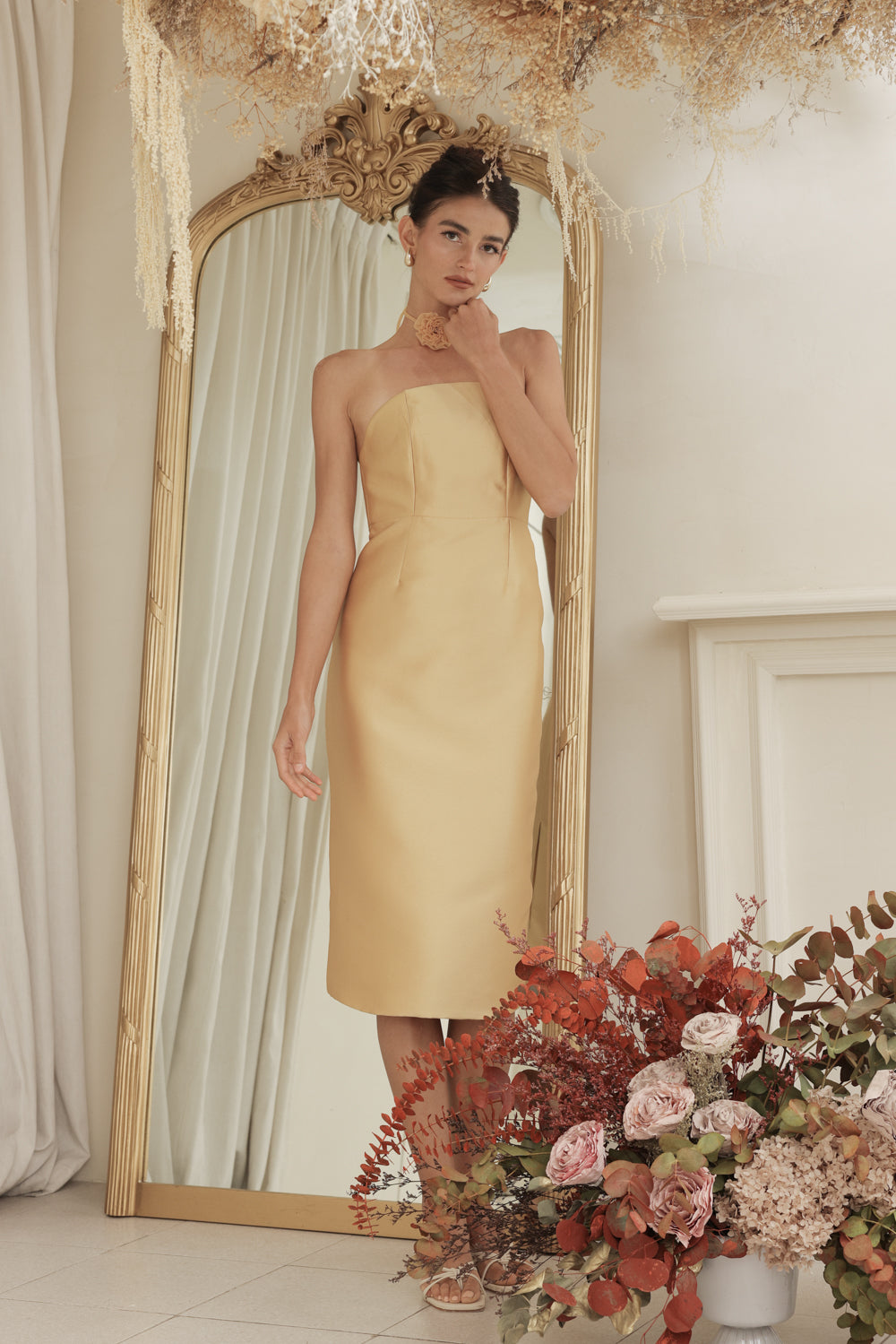 NANCY DRESS Curved Neckline Pencil Skirt Midi Dress with Floral Organdy Neckpiece (Yellow Dupioni)
